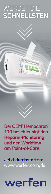 Für die Gefäßchirurgie, Herzchirurgie und auch die intensivmedizinische Steuerung der therapeutischen Heparinisierung von thromboembolischen Ereignissen und Organersatzverfahren verwenden einige immer noch den Routinelaborparameter der partiellen Thromboplastinzeit aPTT. Ob das noch zeitgemäß ist oder ob das mit einem kleinen POCT Gerät zum direkten Nachweis des Heparin-Effekts entweder als Modifikation der Thrombelastometrie oder als Messung der Aktivierten Clotting Zeit ACT, aPTT, oder Anti-Xa besser, schneller und kostengünstiger geht, steht nicht nur in kleineren Häusern zur Diskussion. Es scheint aber noch zu wenig Klarheit bezüglich der Zielwerte bei verschiedenen Indikationen, wenig Evidenz und einige messtechnische Unklarheiten bei den POCT-Geräten zu geben. Gerade bei hohen Heparinkonzentrationen scheint die ACT Vorteile gegenüber der PTT, neben der schnelleren Verfügbarkeit und einfachen Bestimmung zu haben. In diesem Zusammenhang haben wir für diesen Newsletter unser korporatives Mitglied „WERFEN” gebeten, weitere Informationen zur einfachen Messung mittels POCT Gerät bereitzustellen (siehe oben stehende Produktanzeige). In unserem aktuellen Hemotherapy-Slam mit Schwerpunkt „Heparinsteuerung” finden Sie mehrere Artikel zur Steuerung des Heparineffekts. Dieses Thema wird die IAKH auch auf den Transfusionsgesprächen in der Hämostaseologiesitzung weiter beschäftigen. Sie können in unserem IAKH Forumthema „Gerinnung” eine aktuelle Problemdiskussion finden.